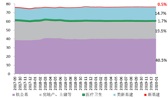 目前存量PPP项目总投资规模大概17.6万亿元,其中铁公基(铁路、公路、港口、码头、机场、隧道)是大头,约7.1万元,占比约近41%;其次是房地产、土储相关,占比20%左右;再次是医疗卫项目占比1.7%。新基建项目仅不足1000亿元,占比0.5%。